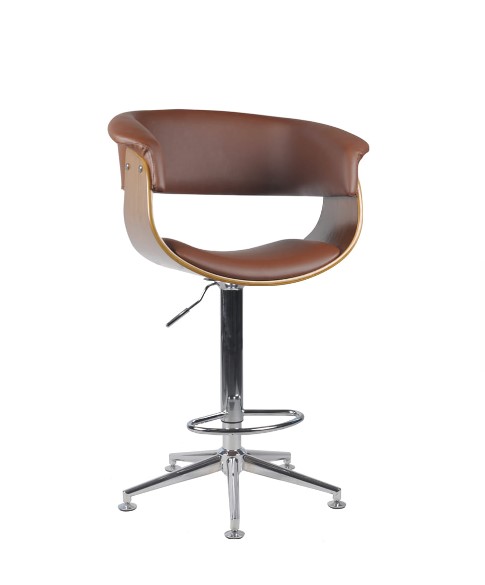BANQUETA GIRATÓRIA COM AJUSTE DE ALTURA, ASSENTO EM MADEIRA REVESTIDO EM PU. BASE EM AÇO CROMADO.