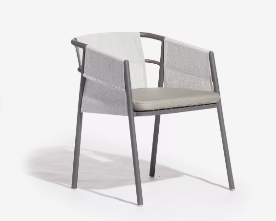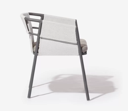 Estrutura em alumínio, assento com almofada, encosto em tela, braços em tela.