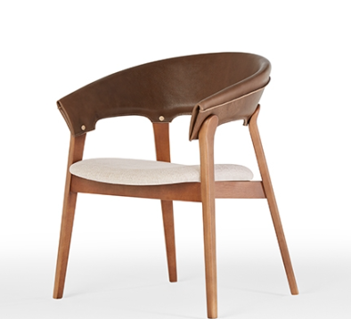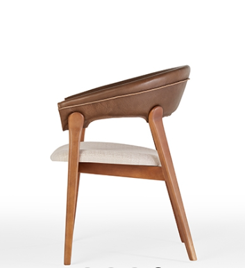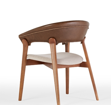 Cadeira estofada com estrutura interna do encosto hibrida e assento em multilaminado estofado. Base em madeira maciça tingida
