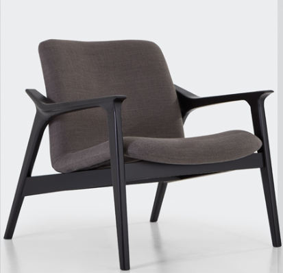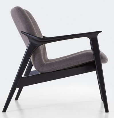 Poltrona com concha em multilaminado anatômico, estofada. Base em madeira fixa, tingida.