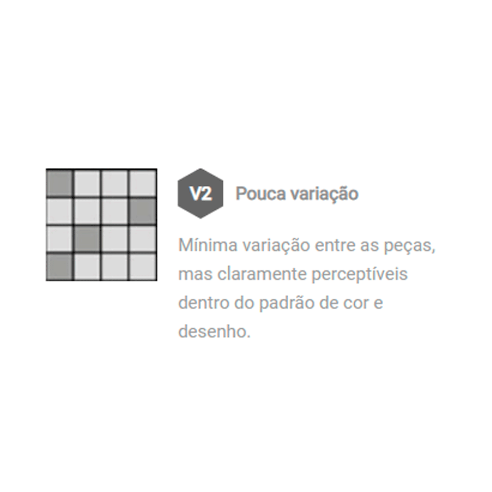 | Variações de Tonalidades | V2 - Pouca variação/ Mínima variação entre as peças, mas claramente perceptíveis dentro do padrão de cor e desenho. |